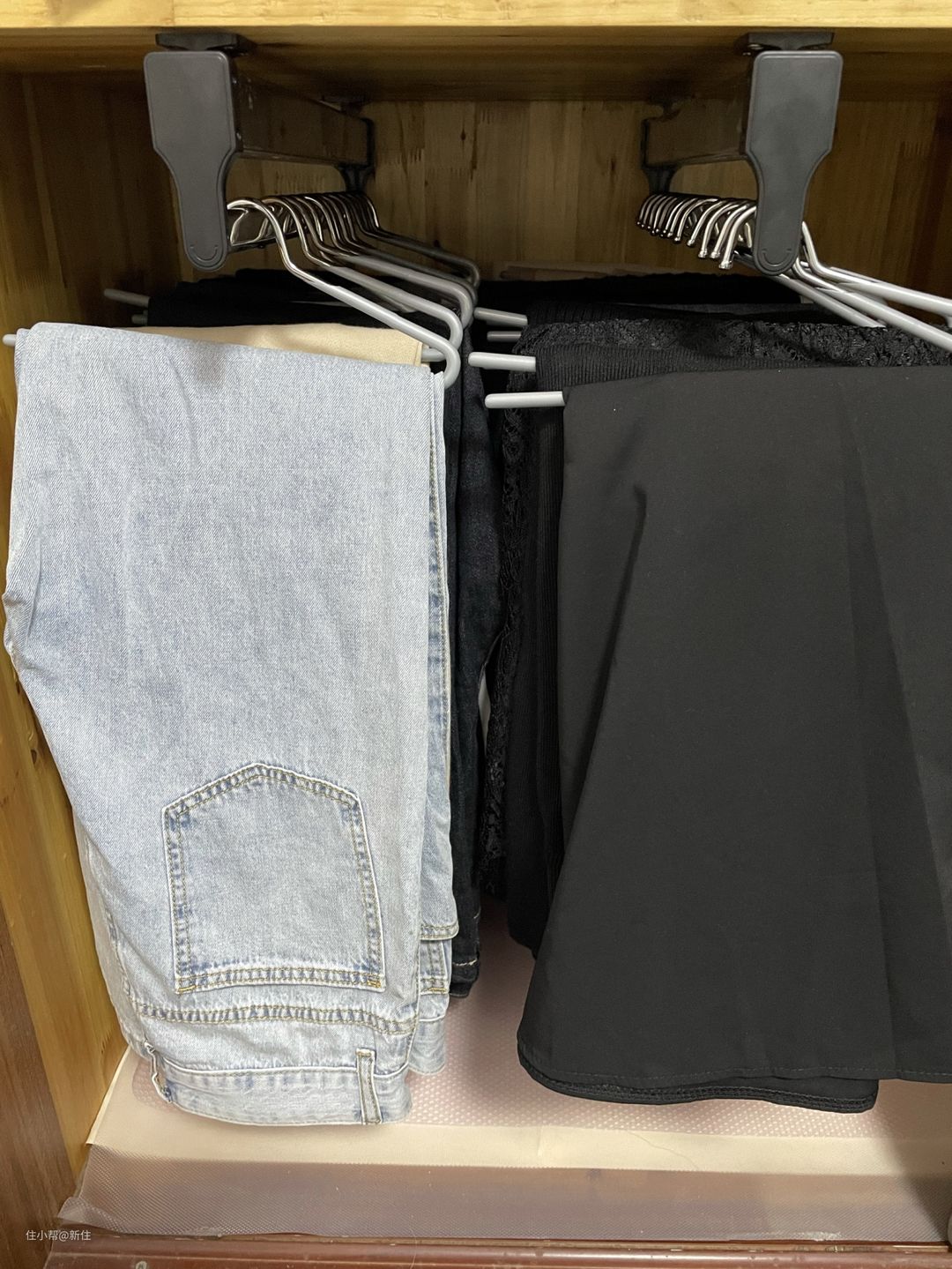 别看商家的精修图,实际看看买家秀,但凡厚一点的裤子,挂上去就是这种的,挂杆上的空间是省了,但下面的横向空间该啥样还是啥样!