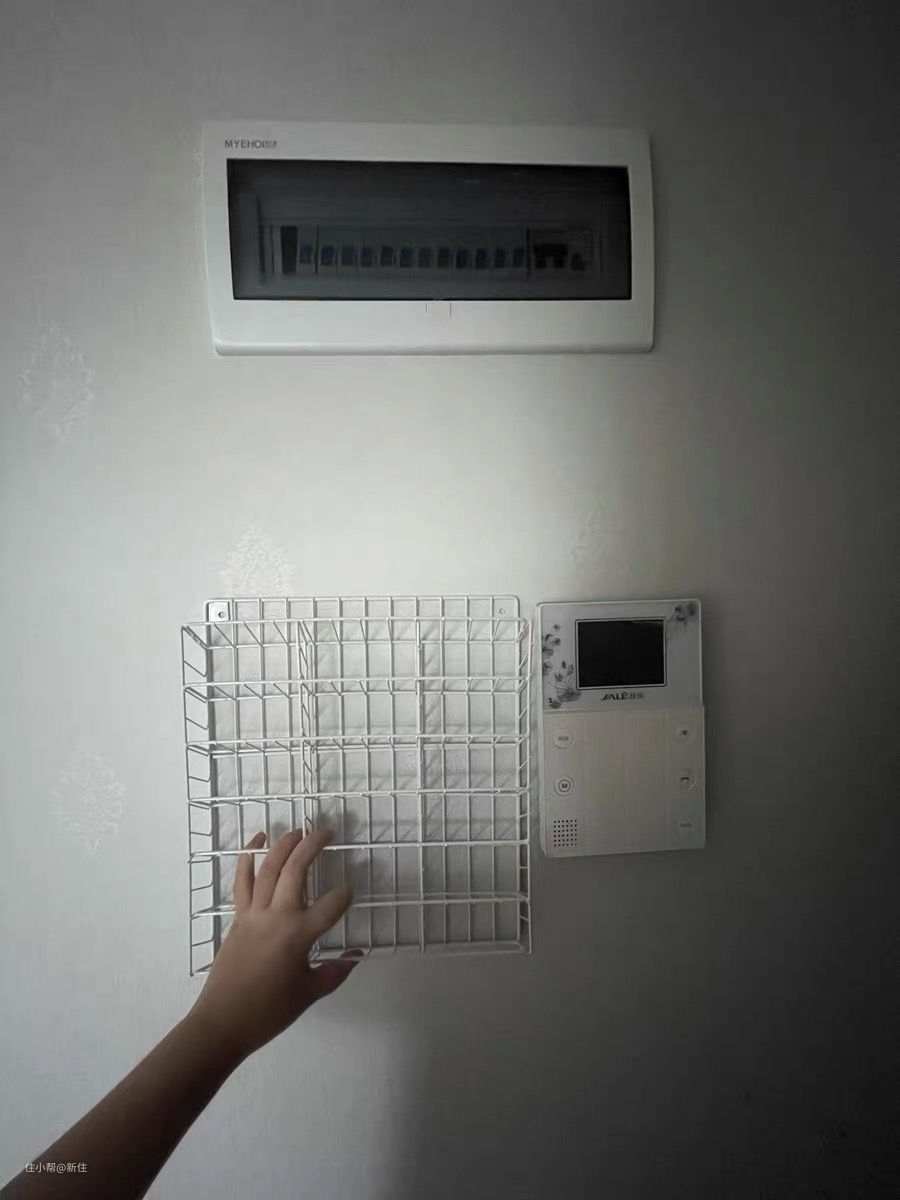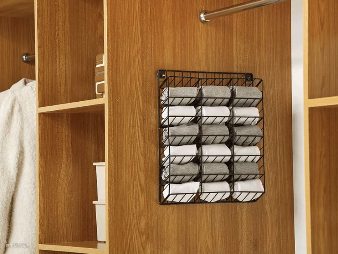 铁艺的架子,被分隔成十几个小格子,粘贴在柜子或者墙面上,用于收纳袜子。