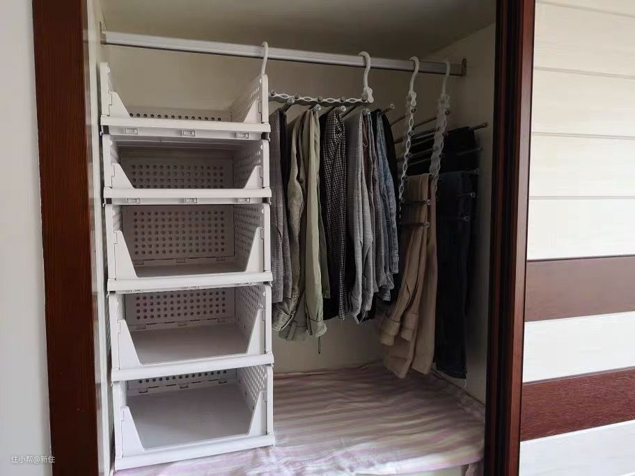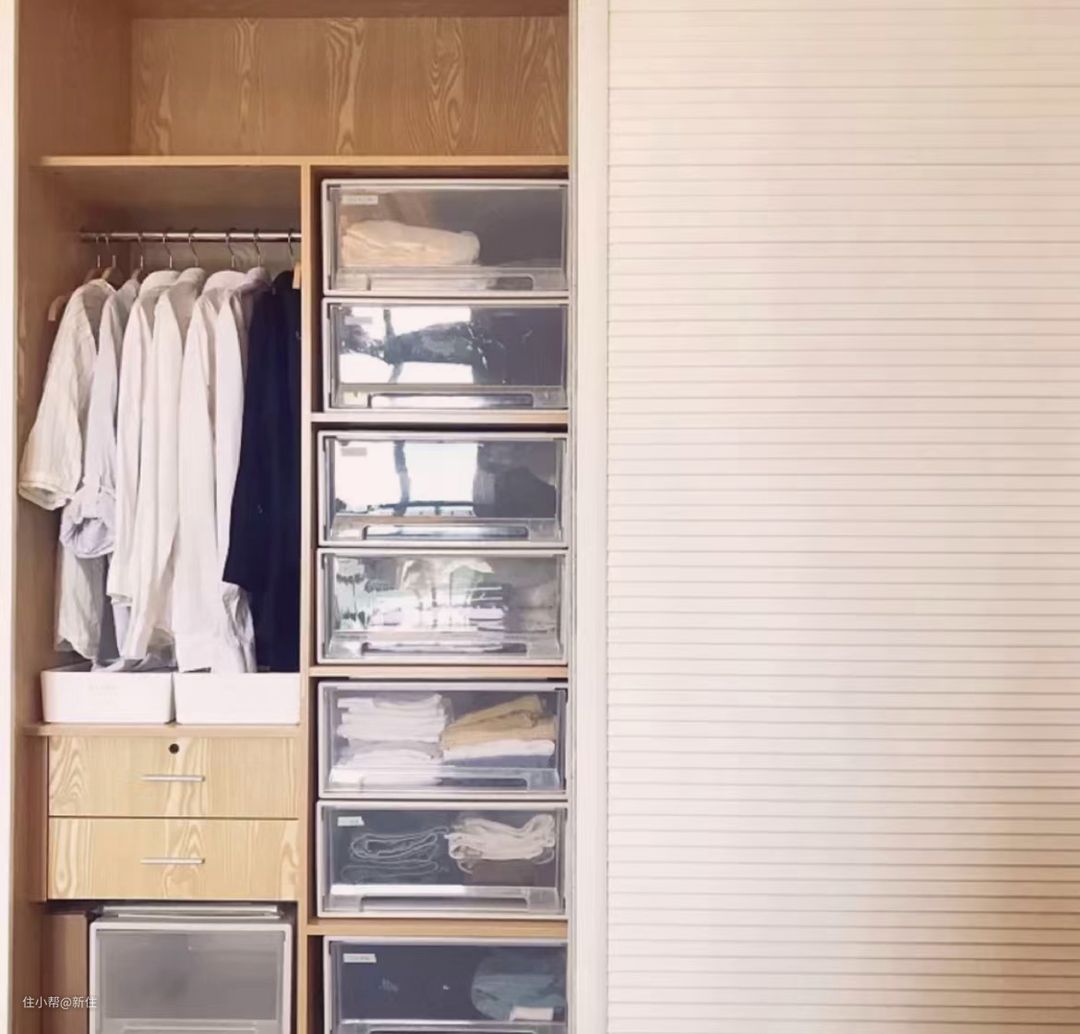 ②可以布局衣柜,在挂衣区多的基础上锦上添花,比如冬季长衣多,就把抽屉式收纳箱挪到短衣区,腾出更多空间给长衣区,其他季节亦如此;
