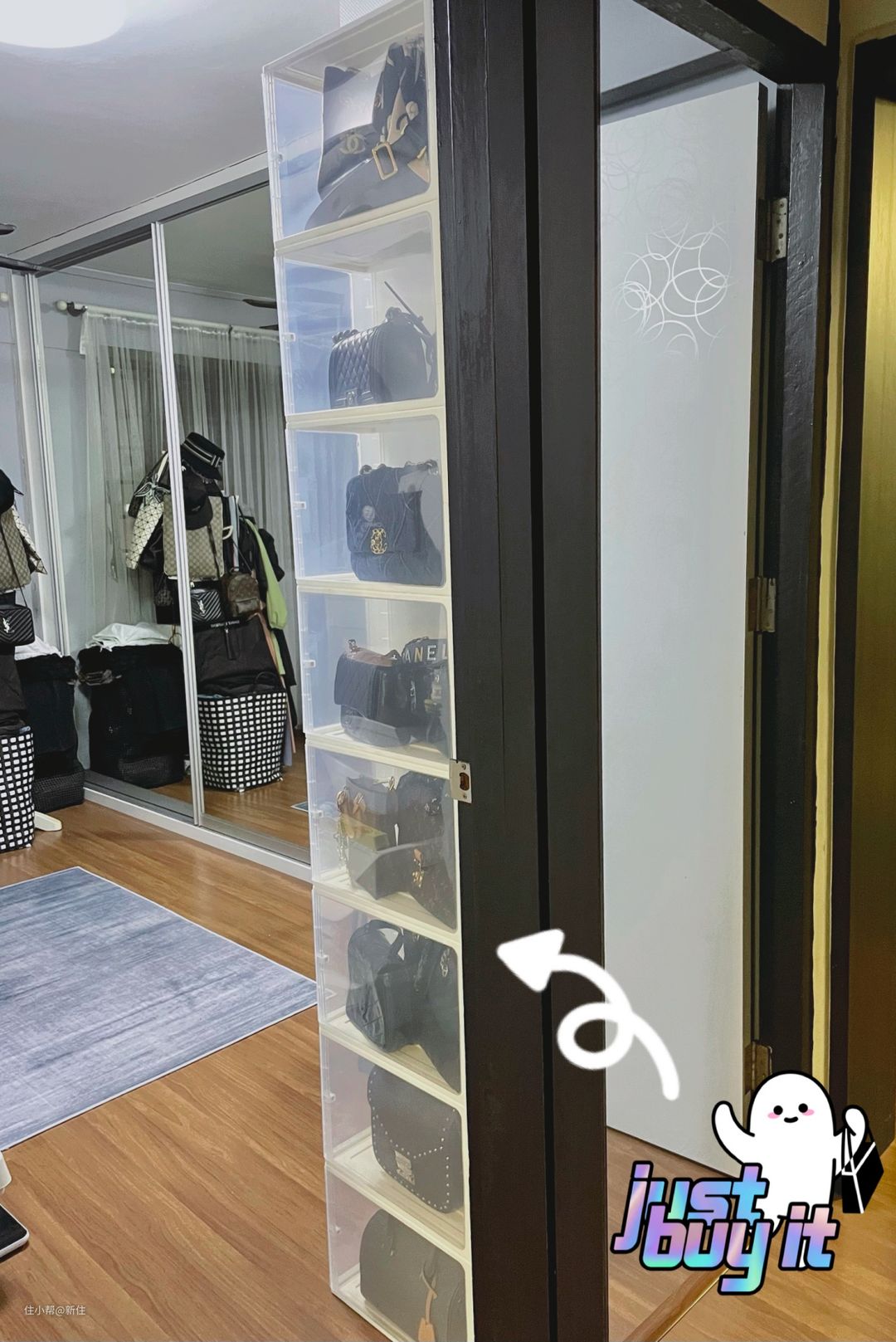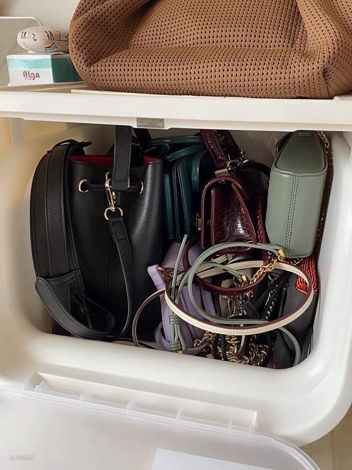 ②透明盒体收纳法:找一个合适的空间,买一些这种包包收纳箱,落尘、变形问题都解决了。