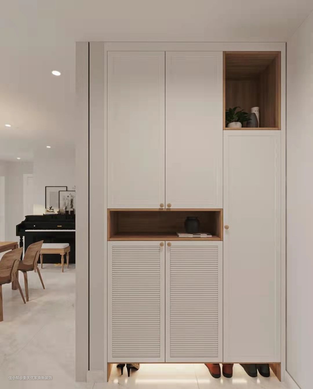 玄关处通顶的鞋柜,增加了不少的收纳空间。鞋柜底部镂空,也方便日常穿的鞋换下。