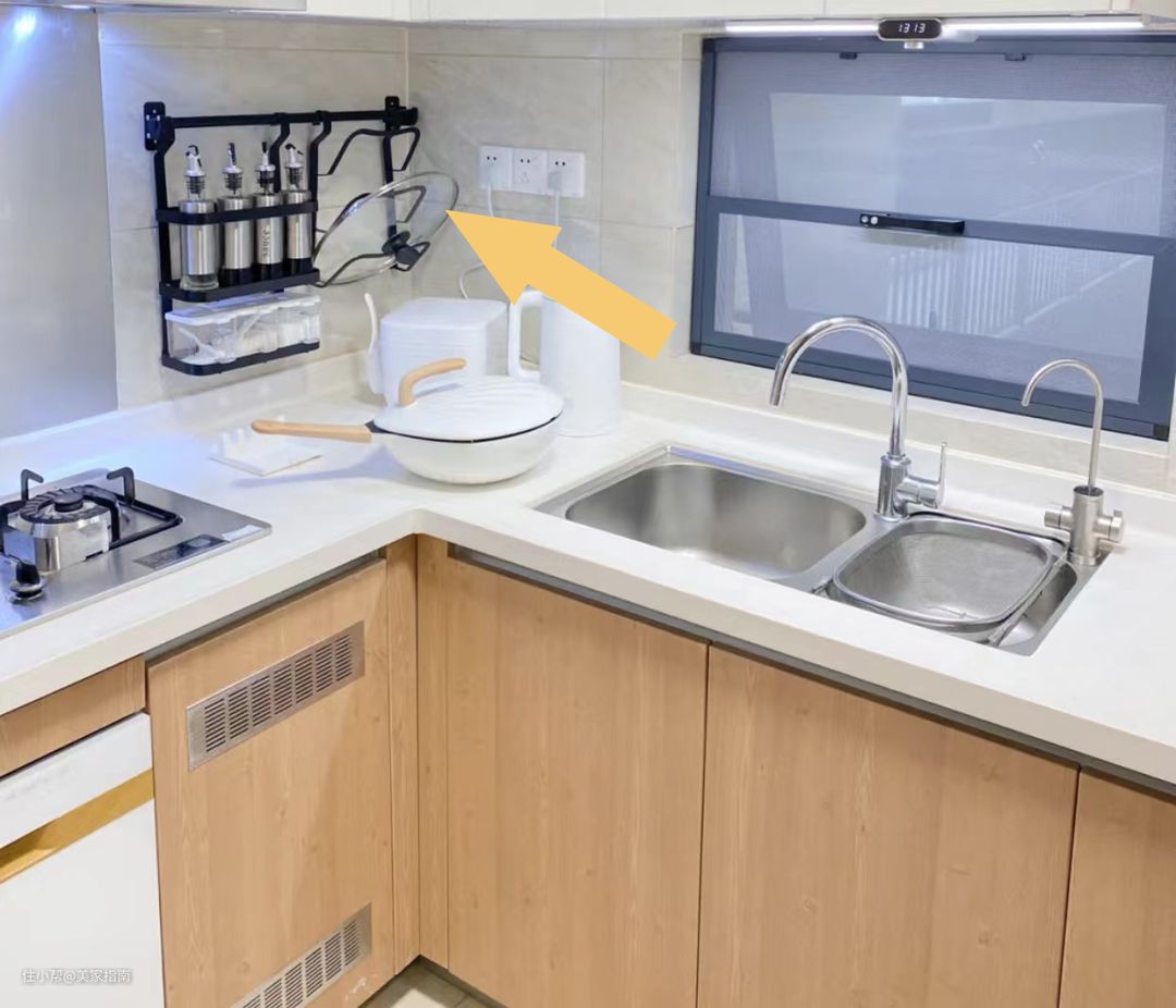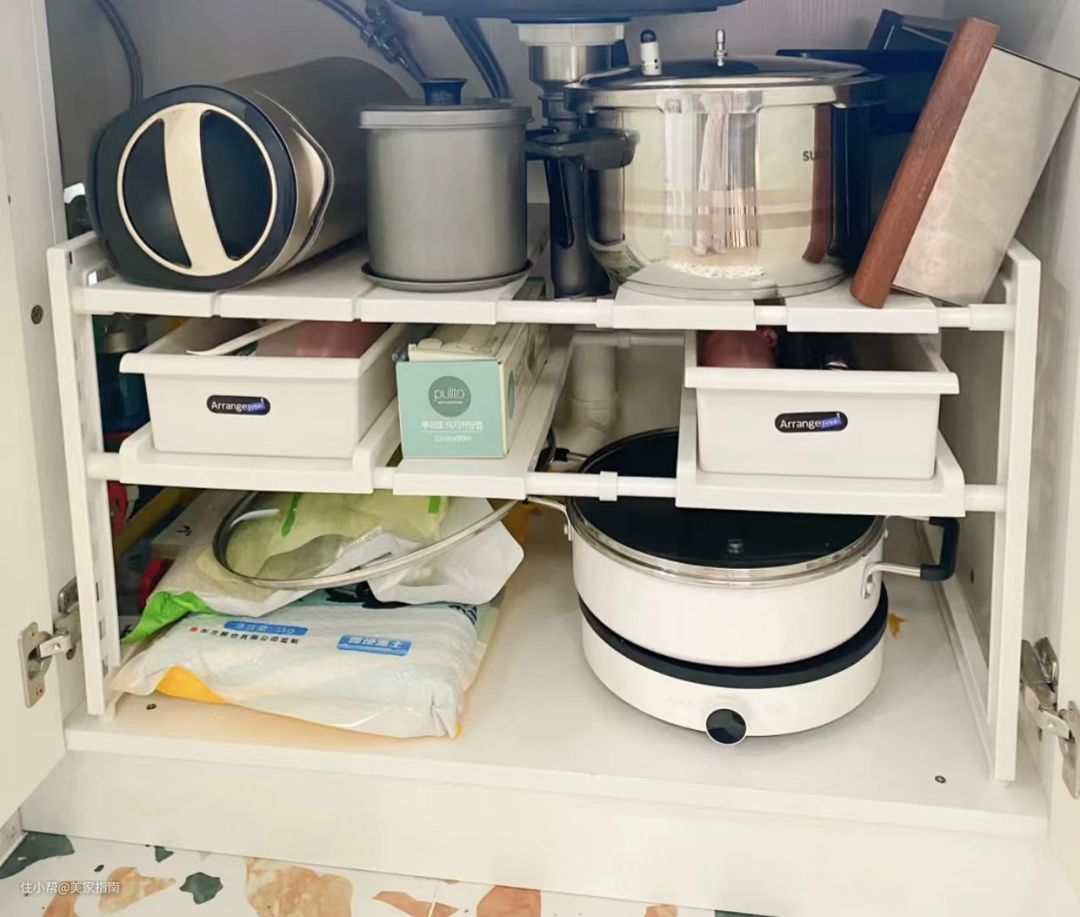 作为一个区区只有4㎡的厨房,很多厨房用品其实放不下。这个时候,我们就要合理做好规划。比如在女主家里,就将厨房水槽下方的柜子合理利用起来了。很多人直接将锅具堆放在水槽下方的橱柜里,这样做法虽然也起到了收纳的效果,但是既杂乱又不好取用。女主家的这种“厨房水槽下置物架”实用性就很强。