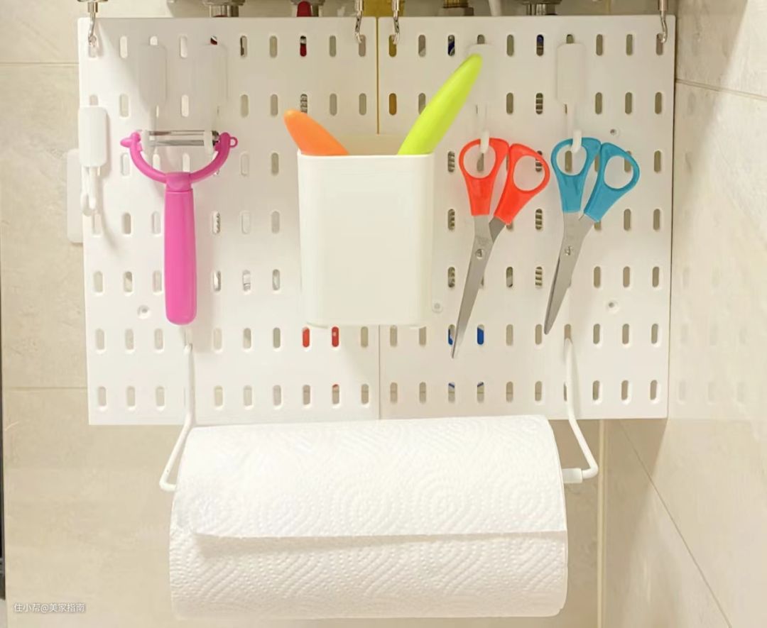 厨房免打孔洞洞板的价值很明显,无论什么厨房用品,都可以直接挂在上面。当然了,最为关键的是,因为洞洞板上的挂钩可以自由安排,所以厨房用品也可以自由悬挂。不仅美观而且超级实用。