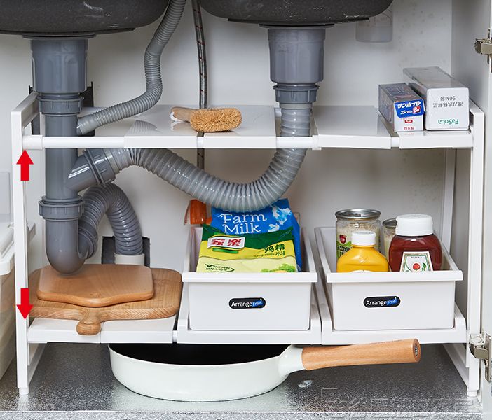 厨房下水槽置物架,最大的优点在于它可以将水槽下的空间划分开来。由于水槽下的管道蜿蜒曲折所以非常占用空间。这个时候一个特殊的置物架就显得很有必要。而且这个水槽下的置物架,不仅可以上下伸缩,在每一层的板子上还可以左右移动。因此在收纳各种厨房用品的时候也很容易归类。
