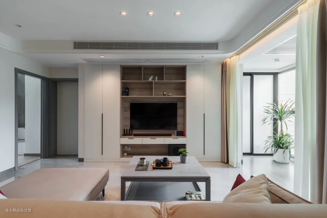 而如果是横厅式的大厅,短短的一截墙只是占了一小部分,并且墙后就是餐厅或走廊区域,这样就可以沙发靠着短墙摆放,另一面完整的墙面就可以用来做电视墙,效果会更加大气;