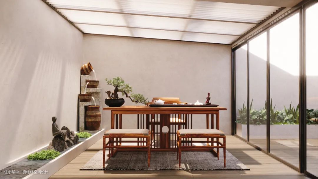 设计师把三楼原来搭建起的顶棚作为阳光房使用,利用玻璃门与顶棚上的拉帘最大限度的将阳光纳入室内,温暖的阳光穿梭在顶棚与玻璃门的微隙,柔和自然地散落在室内,通透而不刺眼。坐在这里品茶、交流、休闲消磨这美好的悠然时光。