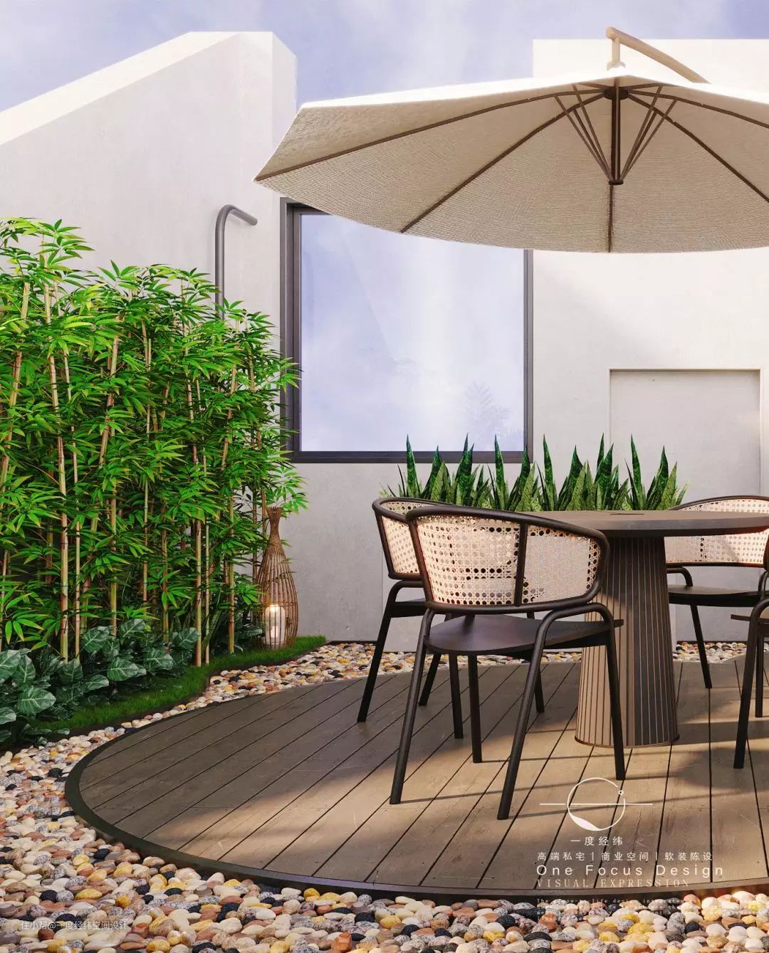 户外以园林景观打造。采用户外木地板、鹅卵石、户外漆为主;利用假山、防腐木地板做了三层长度不一的阶梯,不仅增强空间层次感而且对地面的水管做了掩盖。由于楼顶墙面的管道较多,设计师利用不同的绿色植被进行了遮盖。