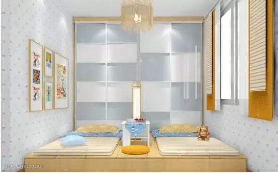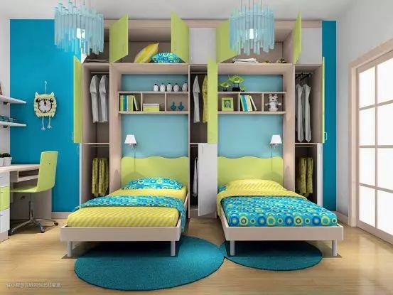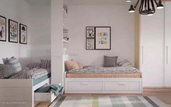 平放式放置两张单人床,中间放置书柜或者书桌进行隔断,增加了收纳空间,孩子的书本文具等学习用品有地可放。但是对空间面积有一定的要求。