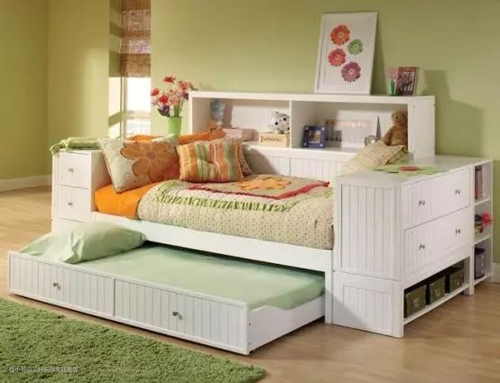孩子睡觉时把下面的床拉出,瞬间变成两张床;孩子游戏时,把床推进去,又可以空出一片地方当成游戏、玩耍区域。上床的高度也不高,不用担心孩子上下床的时候会摔到。而且在下床推进去时也不用把被子收起来,直接推进去就好。