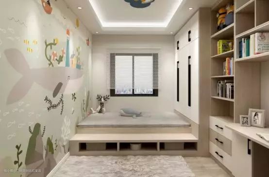 儿童房一般都会留下一个书桌位置,用来方便孩子做作业和学习。榻榻米能够和书桌结合,能够增强儿童房的实用性。将两个榻榻米之间加入隔断既能起到储物作用,也能起到给孩子私密空间的作用。