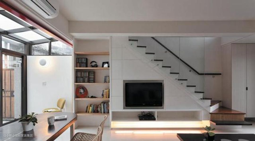 如果正好在客餐厅的部分,那么在储物楼梯位置装上电视机,用餐、休闲的时候都可以看电视,家里也就不会太安静啦~