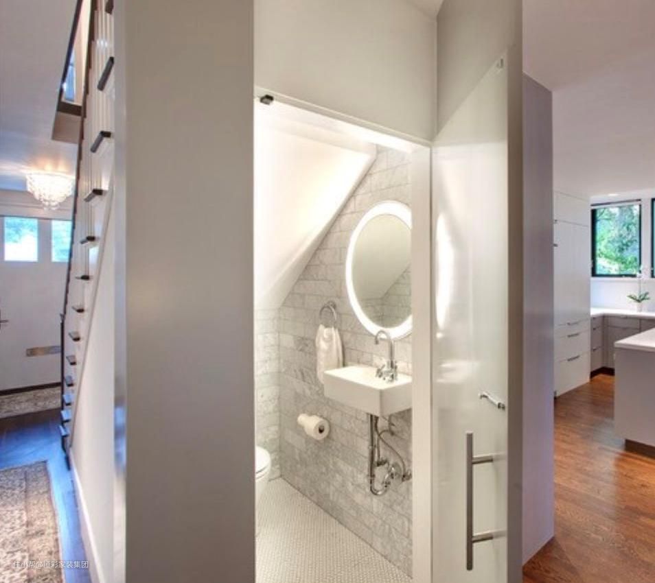 利用楼梯的区域可以做一个小型的卫生间。这种设计也非常常见。特别是复式的别墅,层高比较高,楼梯相对陡峭,做成小型的卫生间是满足基本的使用需求的。