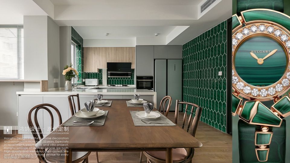 风靡两年的宝格丽绿蛇头,绿扇子,让祖母绿被N多女生种草。有着宝石之王称号的祖母绿,注定是不会庸俗廉价的,这是一套混搭简约美式风,厨房瓷砖大面积选用了祖母绿款,华丽高调,至雅至尚。