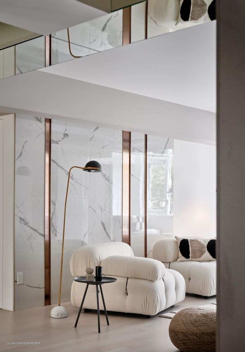 空间以白色为基础,由系统柜和大理石的白色堆叠而成。窗外绿色景观由具有自身反射特性的镜面和镀钛金属材料制成,成为室内设计的一部分;铁件玻璃推拉门取代实心墙隔间,让光线穿透各个领域,营造明亮的生活环境,自然消除了过去昏暗狭窄的走廊,比如透过万花筒看生活,每个角度都带来惊喜。