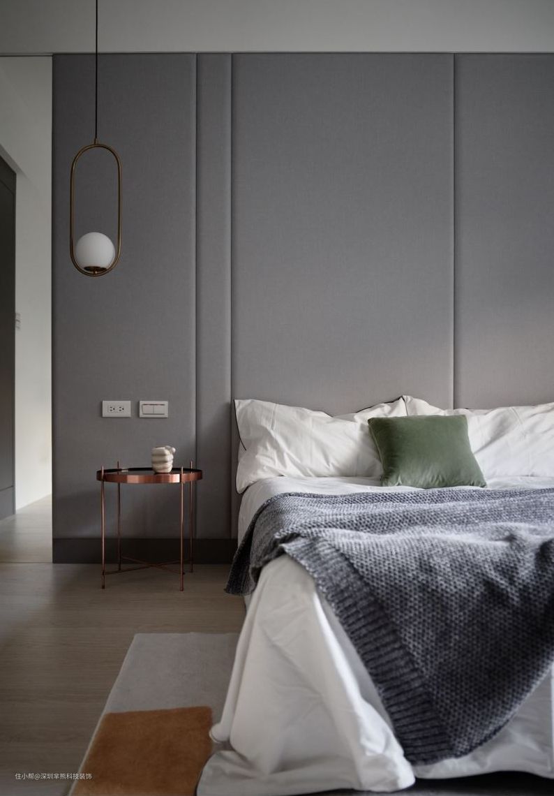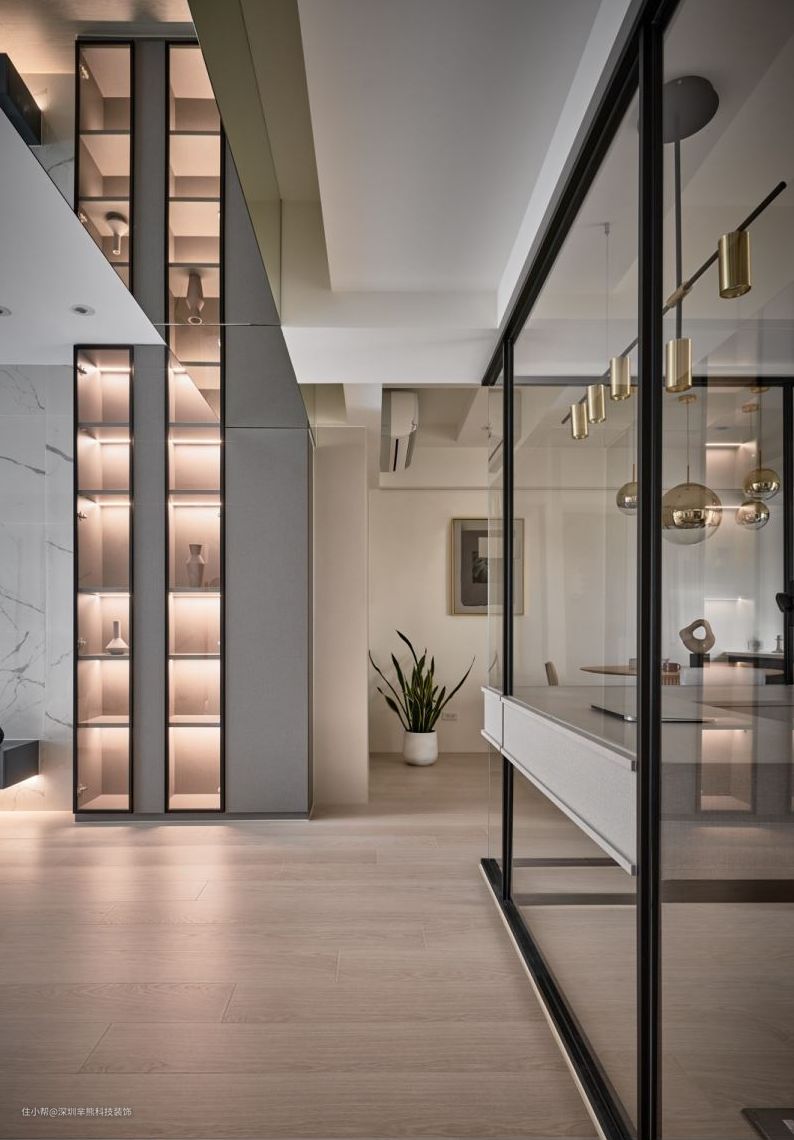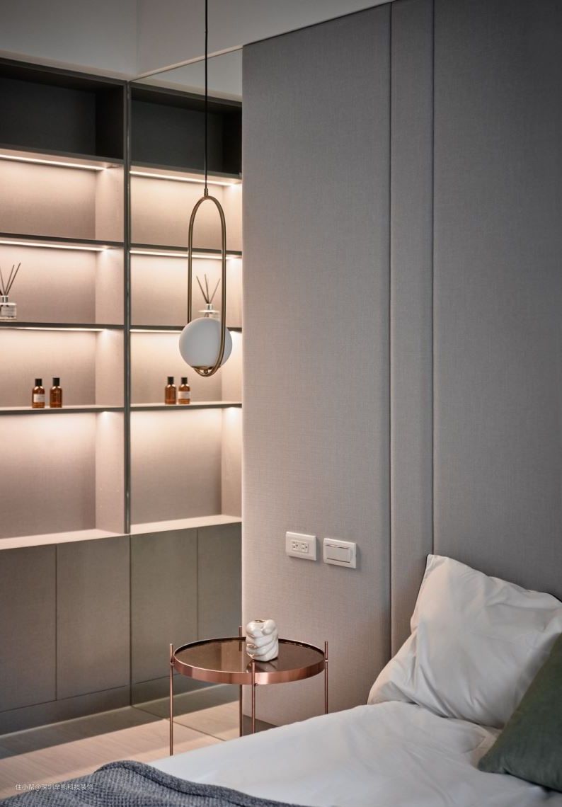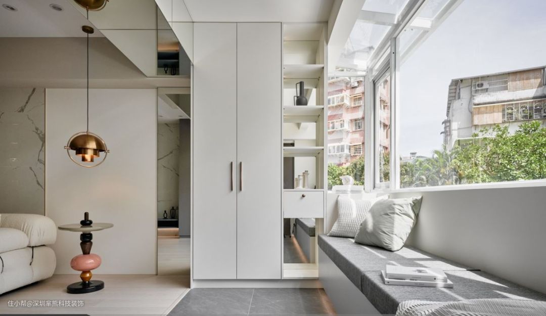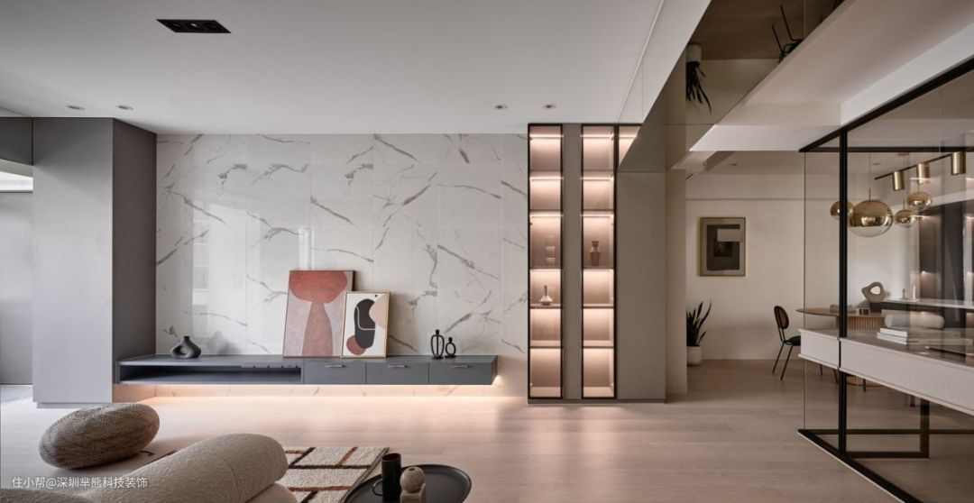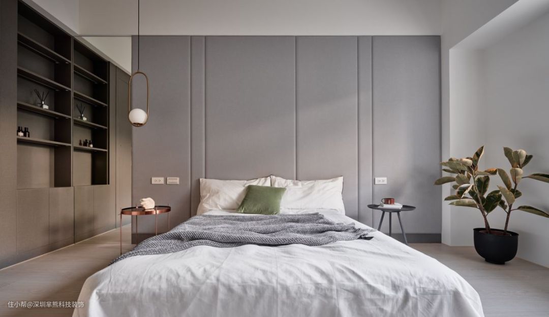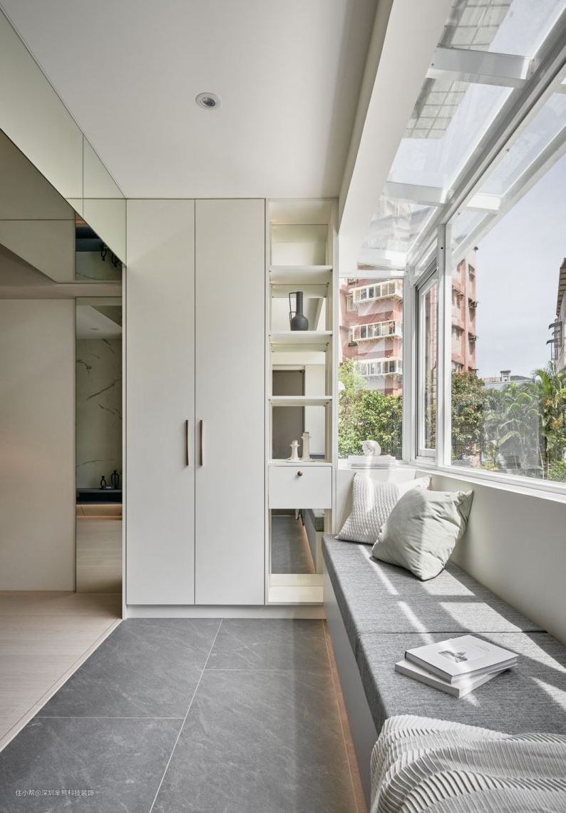 主卧收纳采用L型规划,系统柜墙设计结合衣物展示收纳功能,保留宽敞的走道;床尾用灰色玻璃装饰开放式衣柜,不仅可以轻量化橱柜,还可以在拿取衣物时,内部辅助照明透露出灰色玻璃的温暖光晕,无疑给睡眠空间带来更多的稳定感。