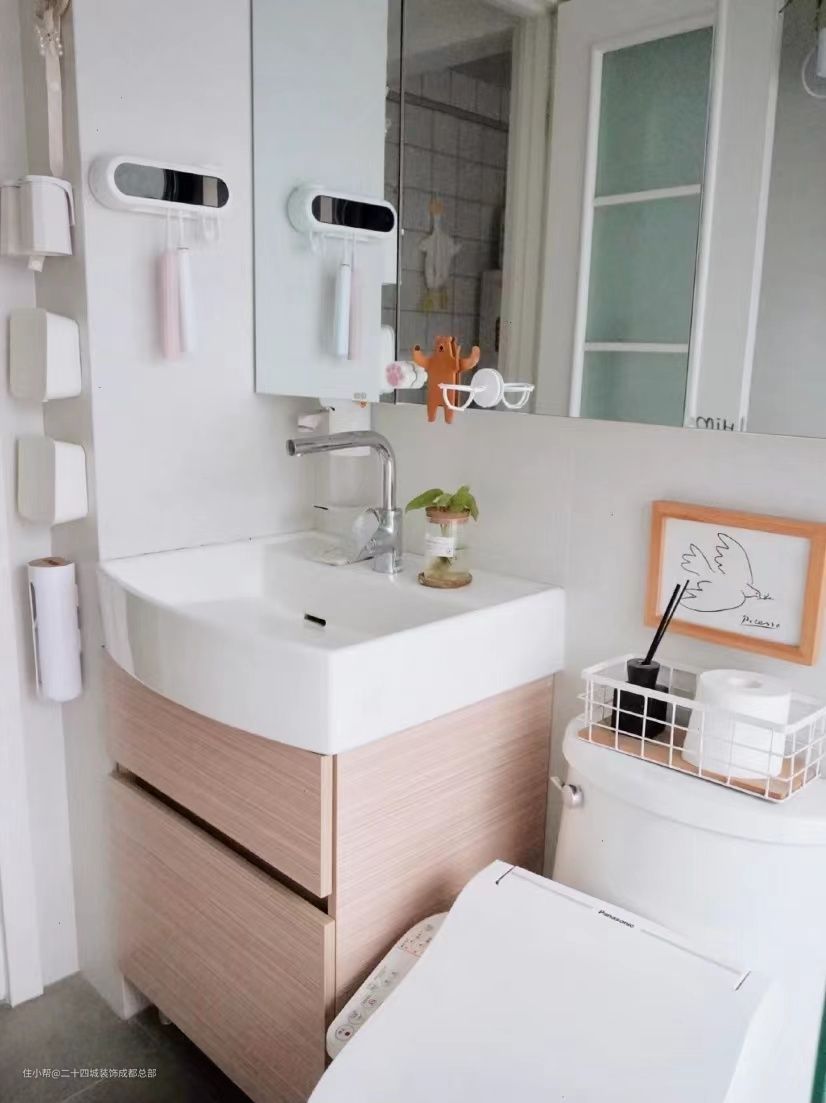 整体面积不大,留了淋浴区和马桶区后,浴室柜的空间就不太多了,整个台面只够一个洗手池,没有空间收纳物品,墙面设计了镜柜,弥补收纳不足的问题。
