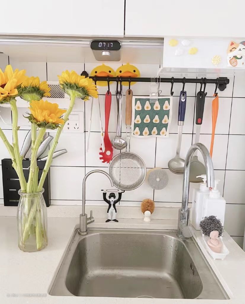 水槽用了大单槽,可以放下日常的炒锅,水槽上方是锅铲、勺子的悬挂区,黑色的挂杆,需要打孔上墙。