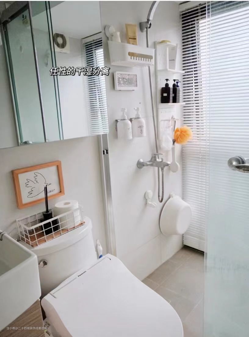 中规中矩,只有4平米,淋浴区有一大面落地窗,所以采光很好。淋浴区比较潮湿,所以用的铝制百叶窗,免打孔安装非常的方便。