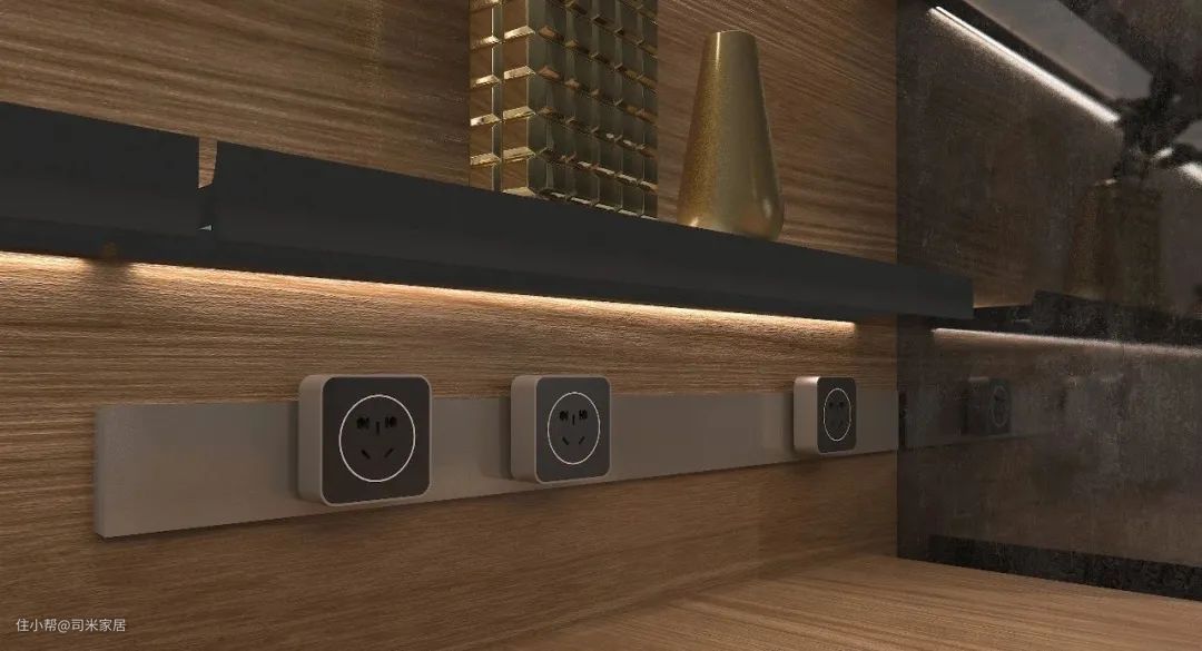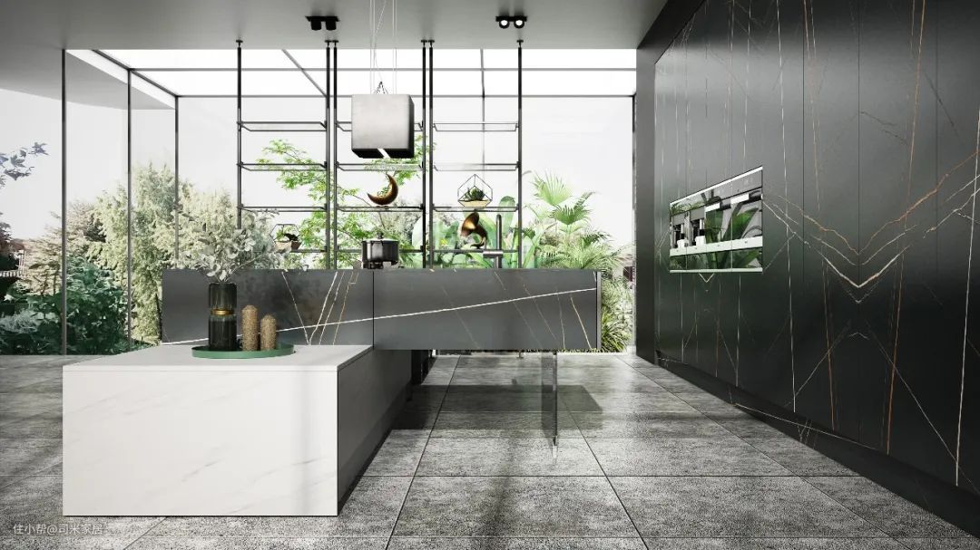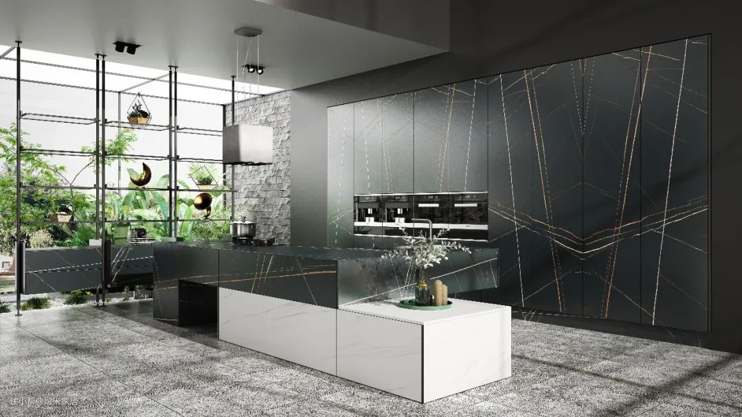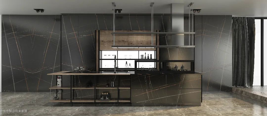 橱柜采用大面积的质感劳伦特黑金,独特的岩层大连纹与局部的结疤白橡相互交融,碰撞出时尚前卫的设计感,酷炫感十足。