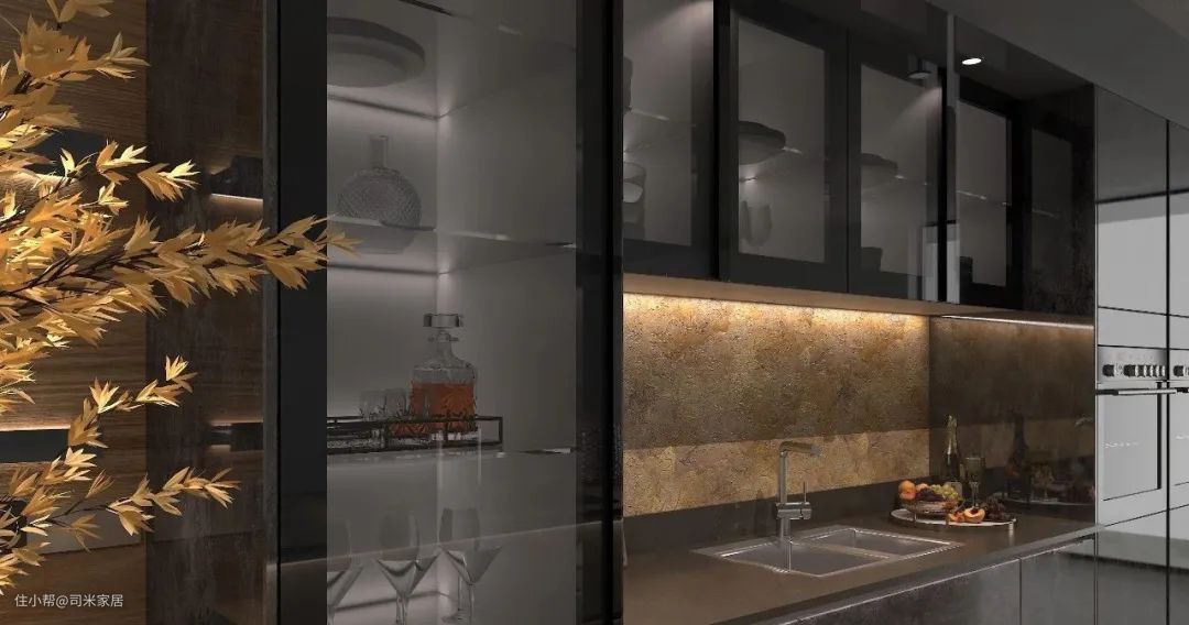 星影pro橱柜,以浩瀚的星空为灵感,呈现出一种璀璨炫酷的工业风格,汇集玻璃门、玻璃层板元素,以其通透明亮特性整体空间以玻璃元素为虚,地柜、高柜为实可变换灯带为辅,虚实结合设计彰显出轻奢精致厨房空间的柔性美与力度感,工业风不再是冷冰冰的“毛坯房”也可以充满质感。