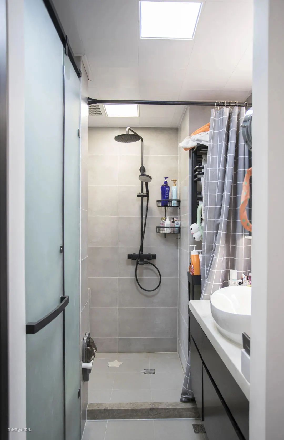 如果空间不够或者不想做隔断,用浴帘和地面挡水条做简单的软隔断也是不错的选择。