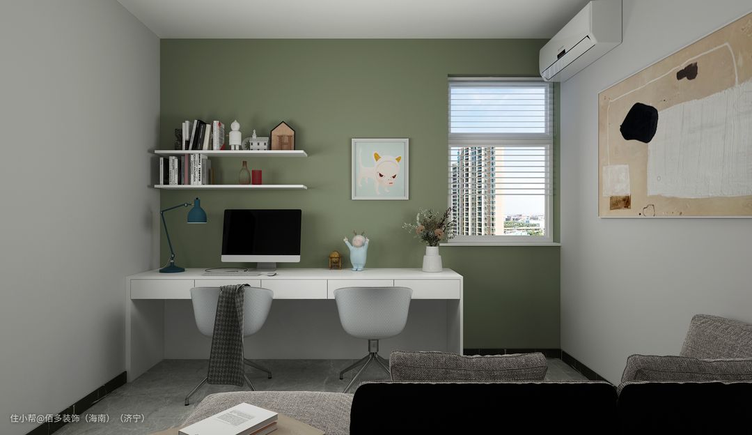 书房形状狭长,根据户型采用靠墙式定制书桌,搭配双层开放置物架。白色与草绿色,充满了青春干净的气息,双工作台的设置,增加了陪伴与感情的培养,一侧沙发可提供休息的作用,随手捧上一本喜欢的杂志书籍坐在沙发上,伴着书香静心阅读,让疲惫的心灵得以放松和治愈。