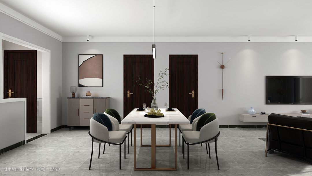 入户开阔空间作为餐厅使用,木色餐边柜搭配大理石餐桌岩板,岩板台面的耐高温、不渗色、防刮花的特性很受极简风的青睐,搭配灰色布艺餐椅,让冷硬的餐厅空间多了一份柔情和温馨,以及网红洞洞板的使用,可随意调节使用位置,方便又醒目。