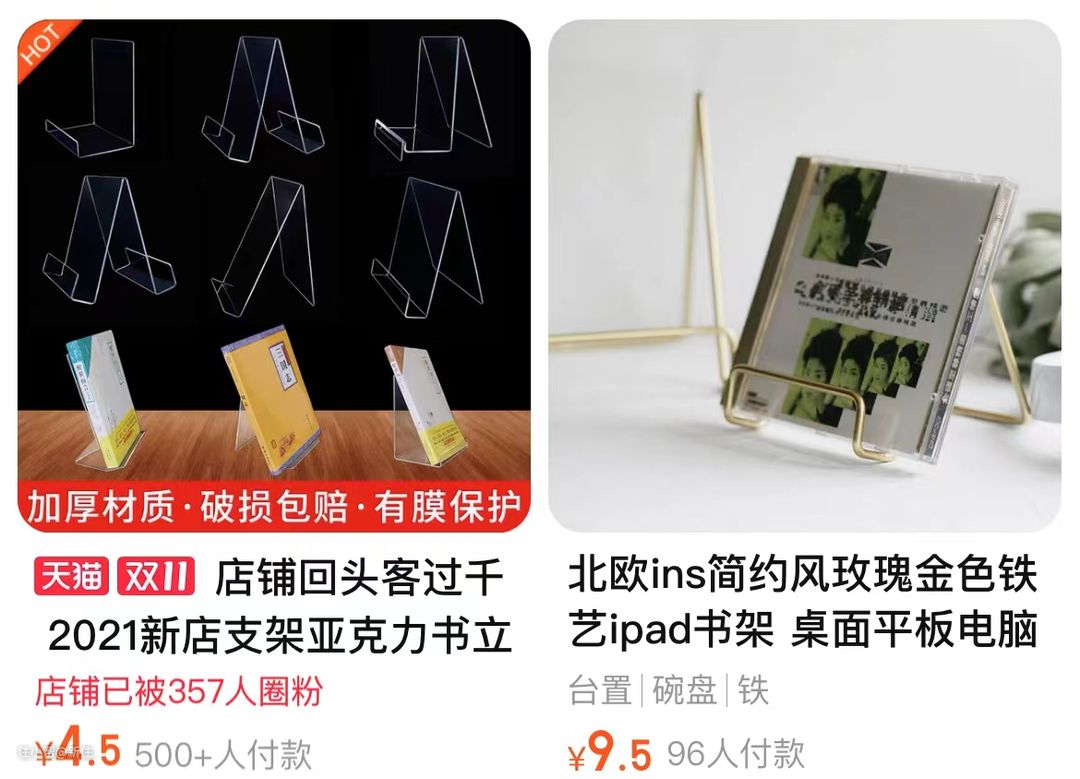 但如果换个关键词,搜菜谱支架或者书本支架,亚克力材质的,几块钱就搞定了,透明质地,颜值也不差。