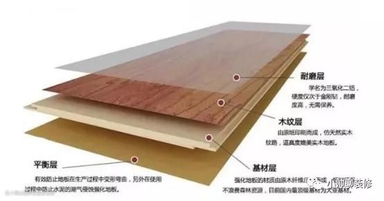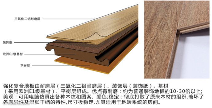 顶层:耐磨层(三氧化二铝)+装饰层(电脑打印的木纹层);