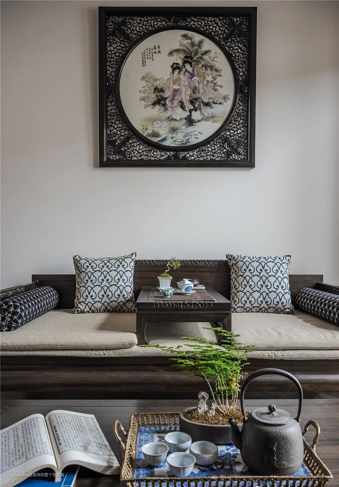 另外一处还打造出一间方便品茶的藏品间,家具选择檀木的中式风格,符合男业主平日的喜好,忙碌的生活中也有闲时的静初时光。