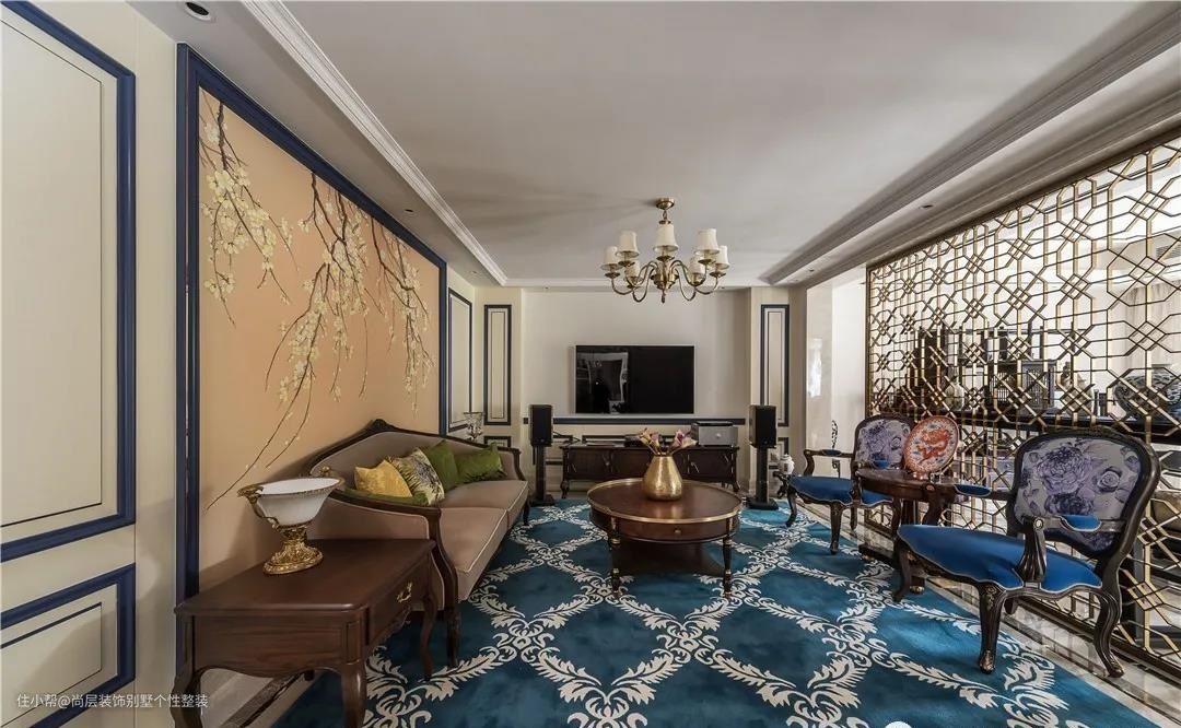 欧式与中式大胆结合使用,以描金的中式镂空隔断划分空间,搭配丝质风景壁画,更是具有艺术化的韵味。