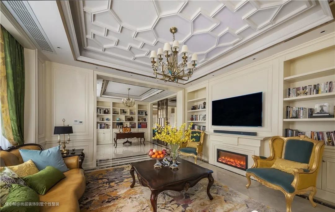 墙面选择了温暖的壁炉造型,定制的内嵌书柜更是将业主的阅读喜好充分完美结合,休闲时,坐在金色的雕花休闲椅上面,阅读也是一种享受。