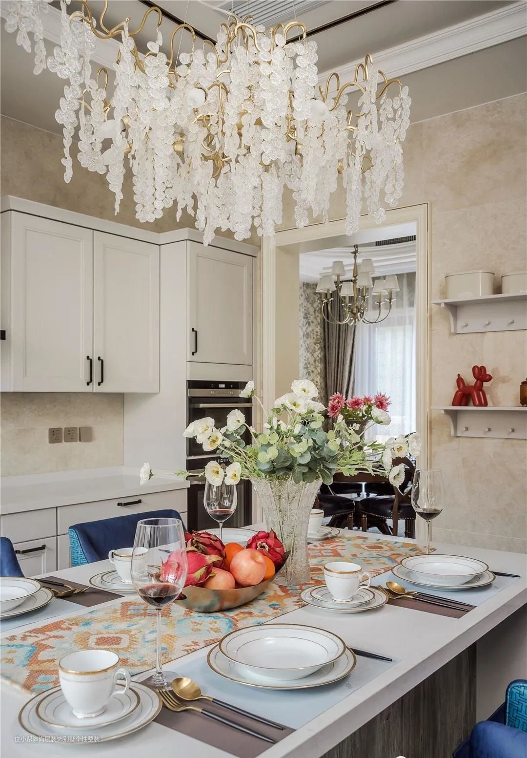 浪漫的水晶吊灯自由的散落在上空,但是安装高度恰到好处,既美观又不影响正常使用视线,坐在西厨的餐台,一家人可以享受美食,又可以互相美好交流。