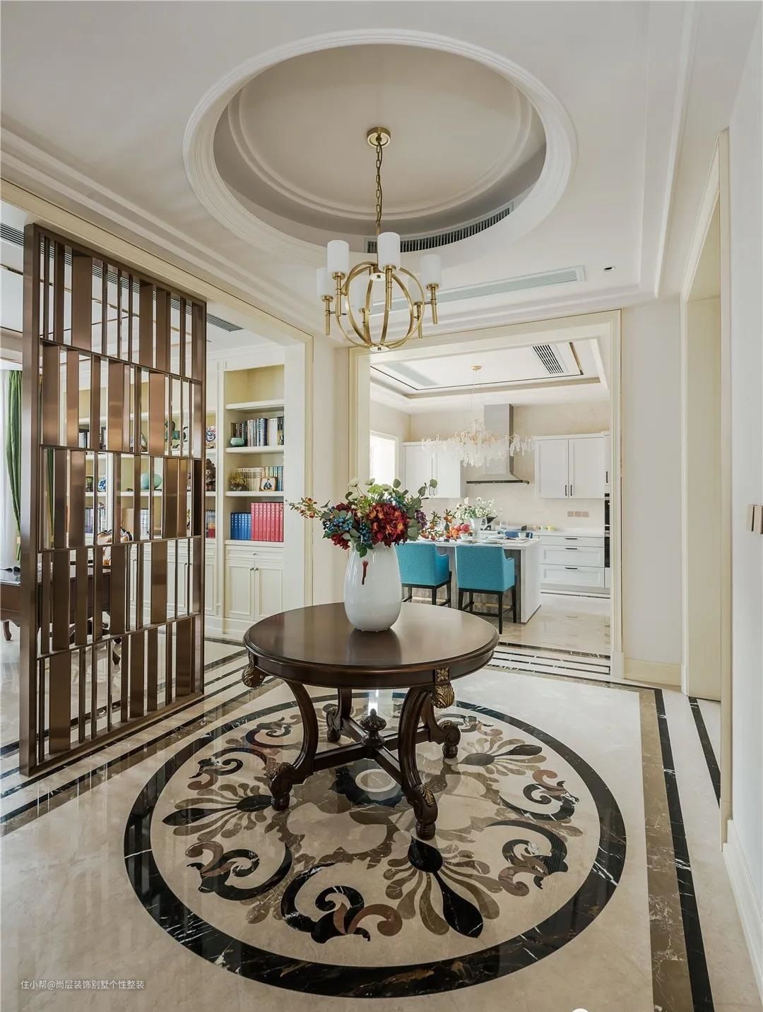 顶面选择了独特的几何石膏线造型,与家具的传统的雕花造型进行呼应,浅色系的空间关系与沉稳大气的欧式家具相结合,使得空间的整体节奏张弛有度。