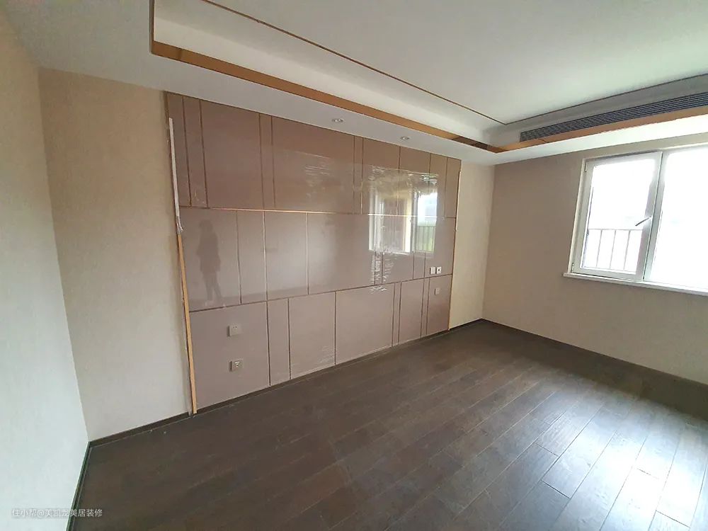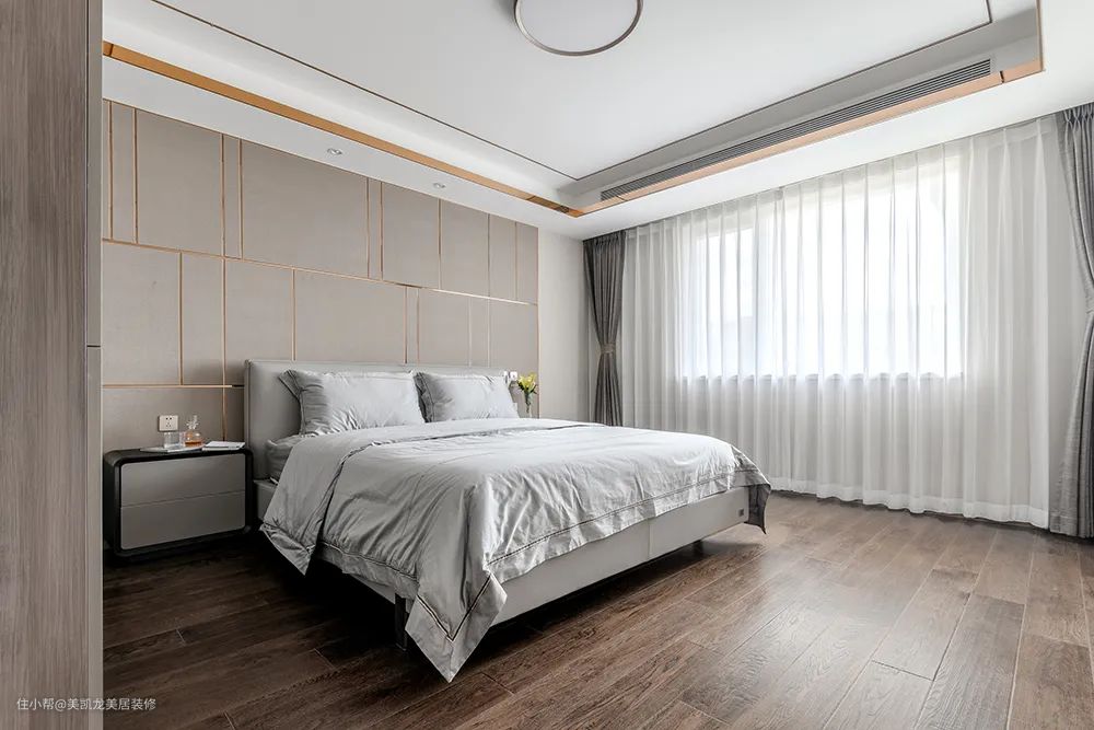 【改造重点】主卧在走廊尽头,与公共区域完全分开,是一个完全独立的空间。延续电视柜的色调和材质,靠墙做一组到顶衣柜,与客厅遥相呼应。