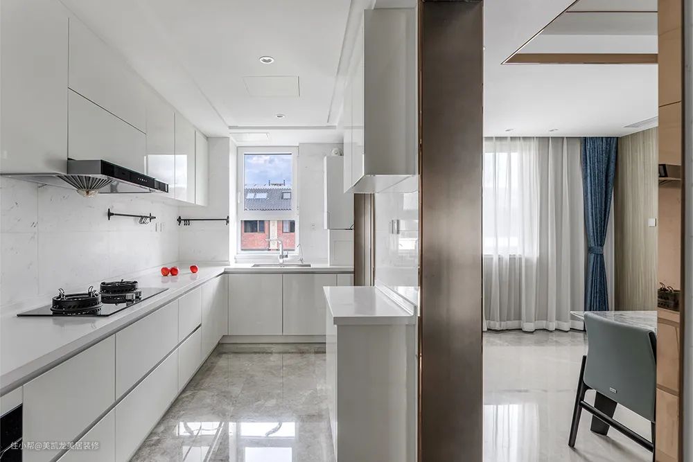 厨房采用灰色地砖与白色橱柜形成对比,显得空间更加明亮简洁。厨房宽度足足有2.3米,设计师在原L型橱柜基础上,于两扇门之间增加一字型辅助操作台,用于放电饭煲、豆浆机等小家电。