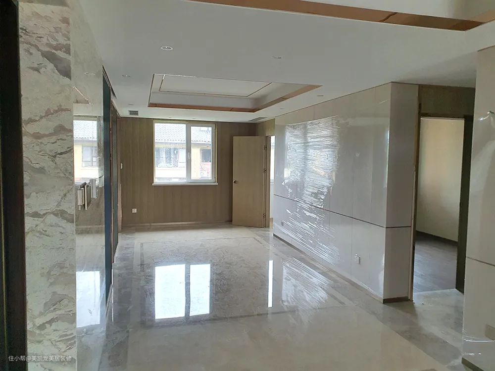 【改造重点】在原有精装基础上,设计师在玄关端景左右两侧,采用米黄色木纹墙板增设对称式方形立柱,使得进门后的第一处景更完整大气。