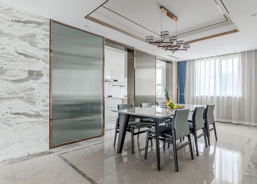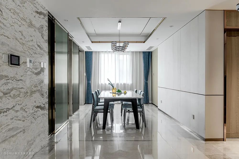 餐厅利用金属线条、灰色调餐桌椅、蓝色窗帘,在中式风格中,交织呈现出现代精致感。到顶门洞设计从视觉上增加了空间高度,两扇移门后藏着人间烟火气。