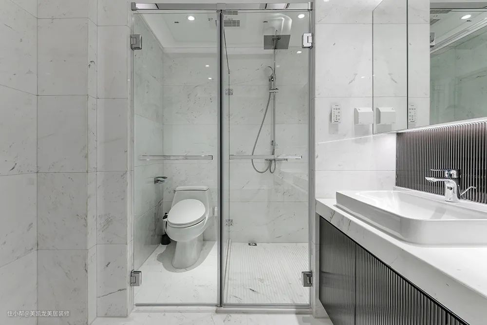 主卫的顶、墙、地,被简约的“鱼肚白”填满,看起来格外清爽,其韵悠扬,颠覆卫生间昏暗、潮湿、沉闷的刻板印象,干湿三分离更是大大提升了家庭生活的效率。