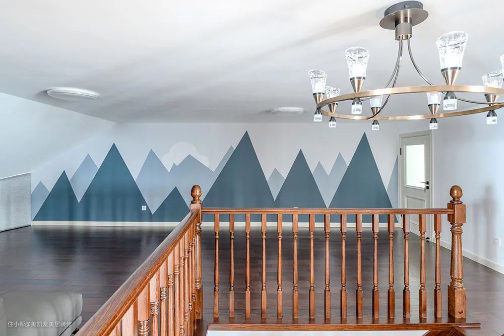 楼梯口是属于姐弟俩的娱乐室,姐姐可以在影音区观影,弟弟可以在“峰峦”黑板墙上尽情发挥创作天赋,默默相伴,又互不打扰。