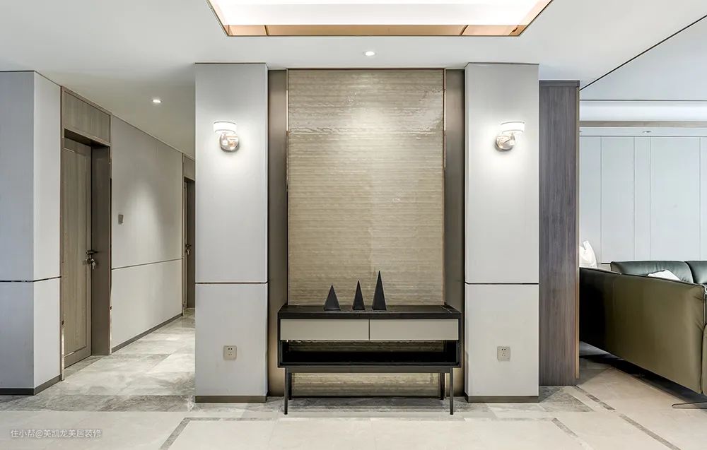 开门后正对玄关端景,这是设计师在动线主轴上安排的第一个视线点,一点也不复杂,仅仅只是组合了端景墙和端景柜,能展示、可储物、有格调,轻而易举地奠定了整个空间优雅别致的基调。