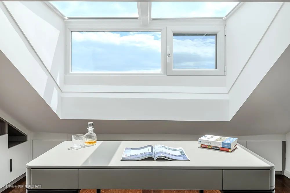 阁楼的层高偏低,大多数地方无法直腰站立。为了充分利用斜屋顶下的空间,设计师对阁楼天窗进行改良,不止高度、采光、通风增加了2倍,同时也拥有了得天独厚的绝佳视野和观星地。