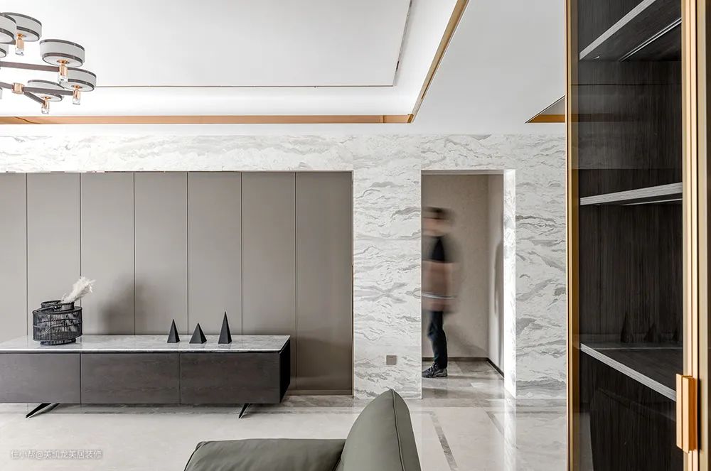 石材纹理自然流淌,木饰面元素简单,搭配黑胡桃木大理石电视柜,黑白灰三色交织,恰到好处,毫无冗杂之感。