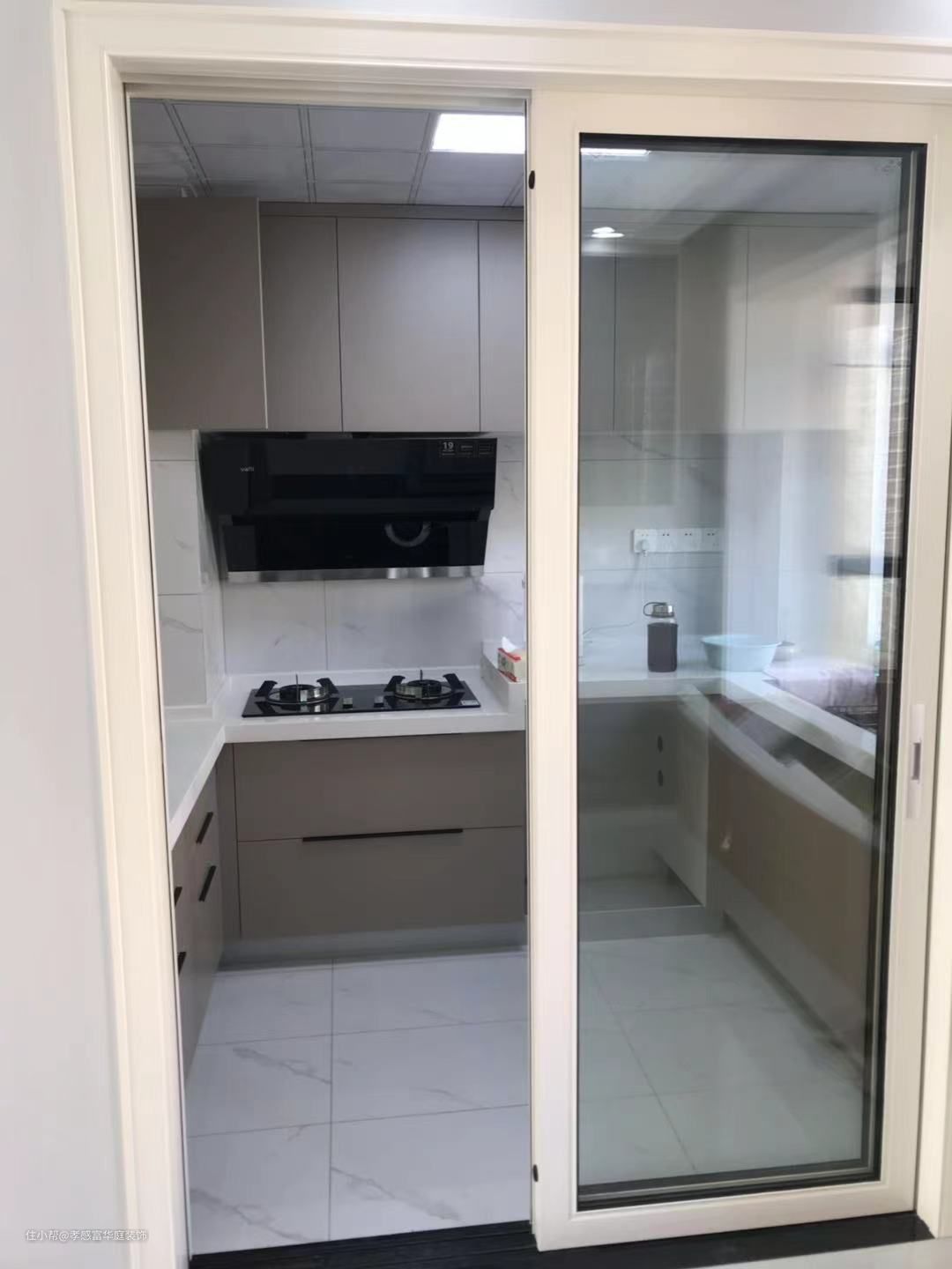 入户收纳柜及厨房吊柜、地柜选用的是香槟金色,看起来有质感,更高级,