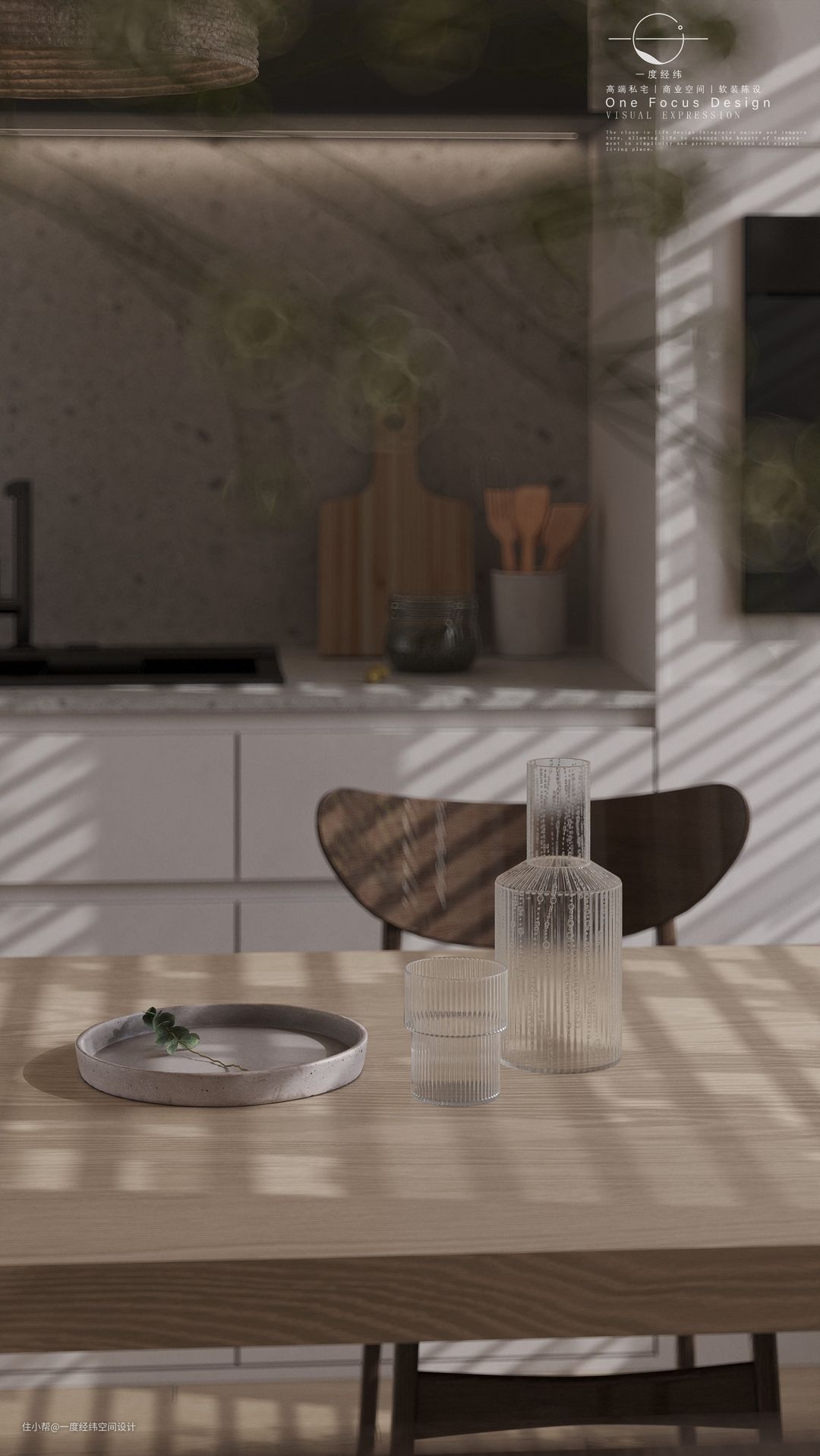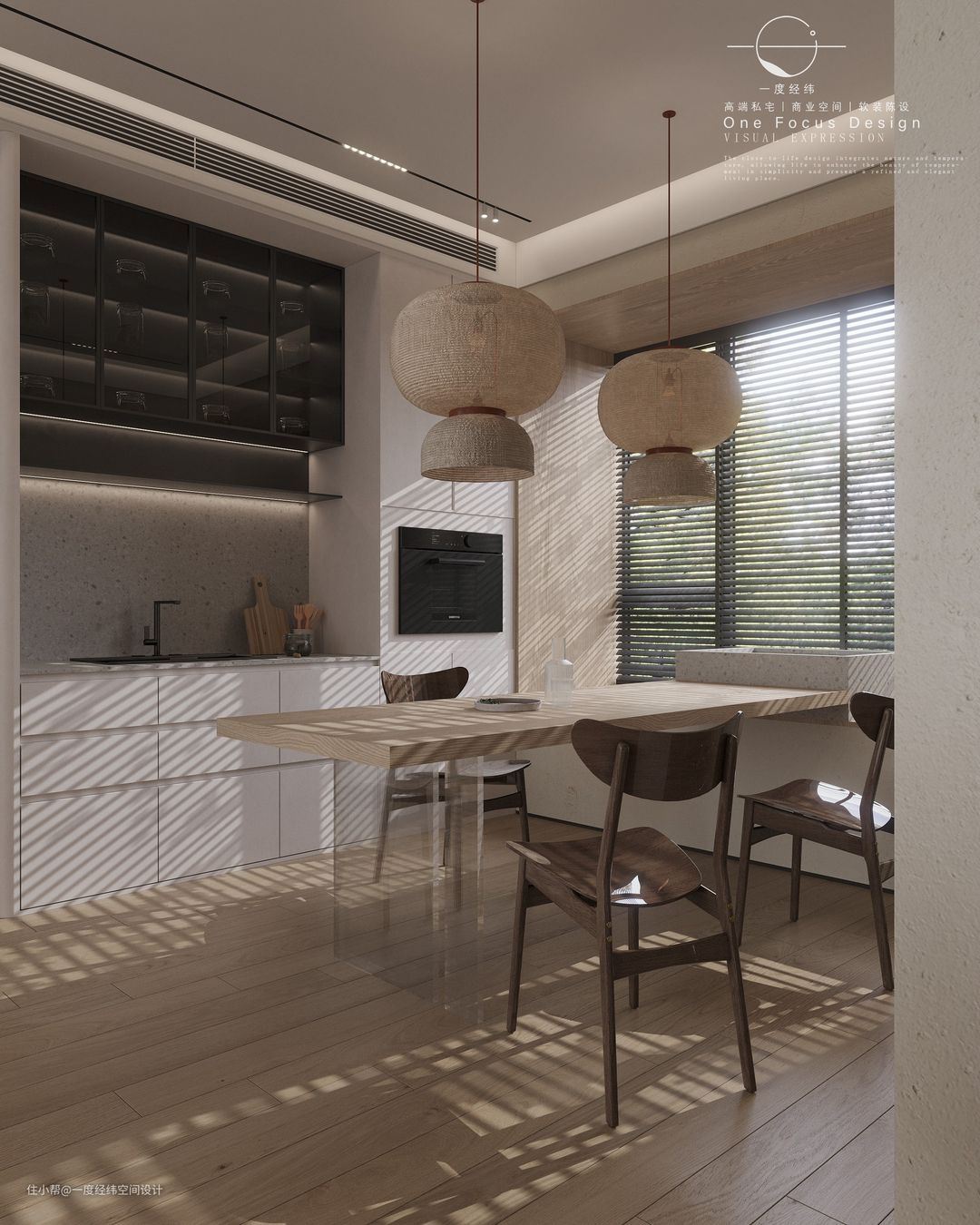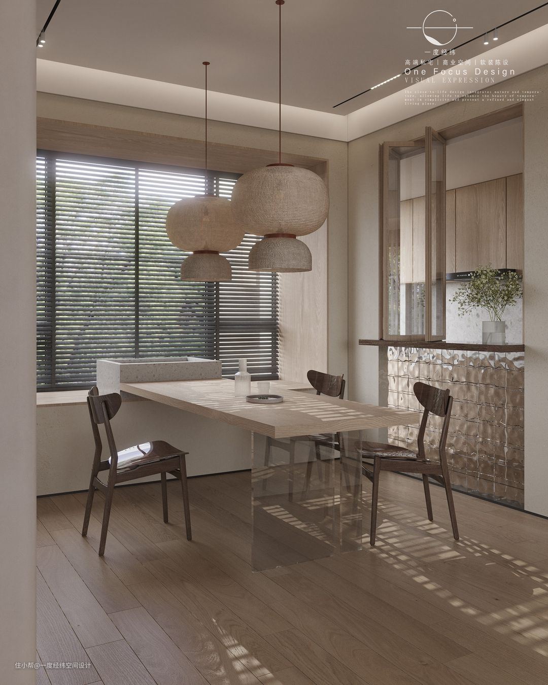餐厅大量的木色作为空间主打基础色,以透明玻璃砖和棕色为辅助。旁边的餐边柜,则是收纳+水吧+烤箱的组合,是围绕用餐基本需求所做的设计,为使用提供了便捷。