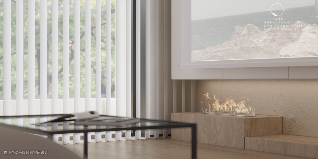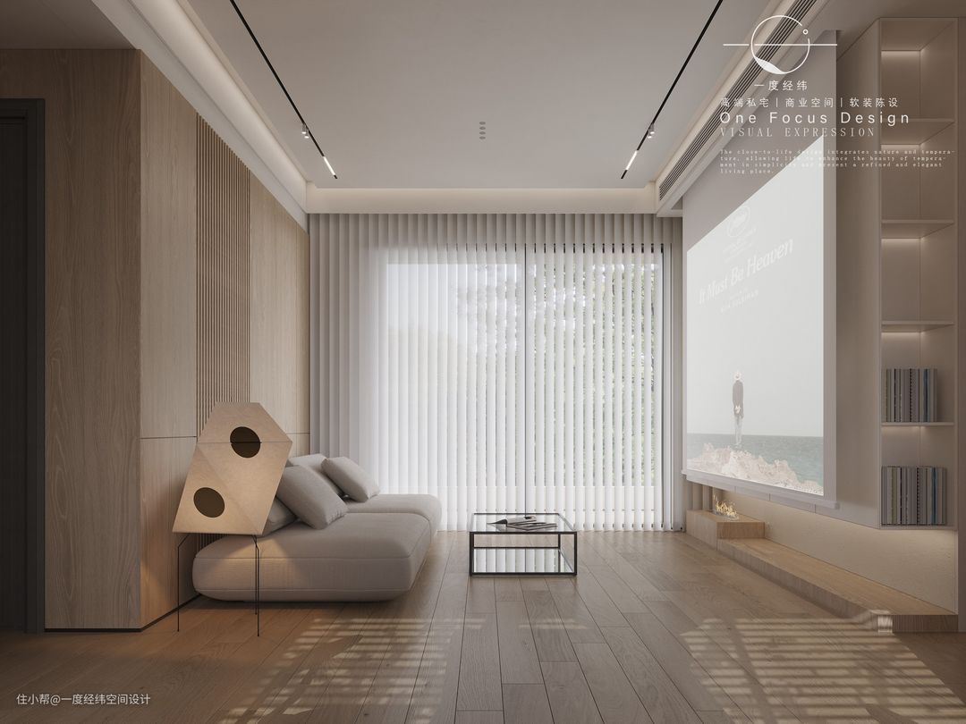 电视墙设计成整面收纳墙,用投影幕布替代电视,既保证收纳又有观影功能,一举两得。而沙发旁边增加局部木格栅设计,为空间保留了禅意与灵巧,又不失气场与舒适。