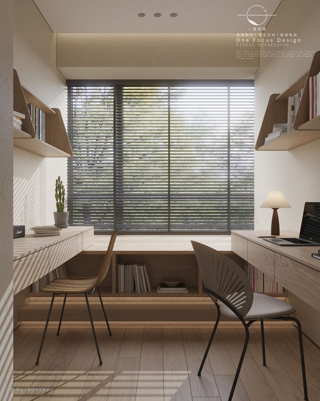 由于业主夫妻两人会在家办公,在书房清晰地划分了两人的办公区域,让两个办公分区得到功能最大发挥。整个空间交互式开放,能感受到彼此的存在又独立于各自的空间,可以专注地做自己的事情。