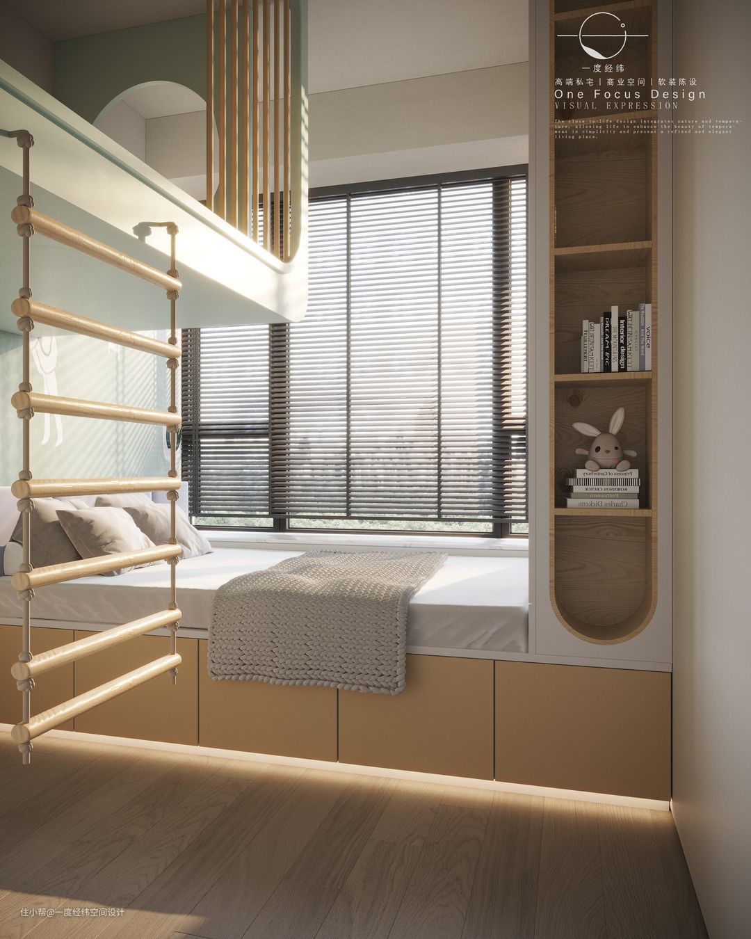 儿童房利用飘台位置做了床,下方做了收纳柜与书架方便收纳与存放绘本。高低床薄荷绿的清新设计与木色的元素的融入,为宝宝营造一个清爽舒适的小天地。