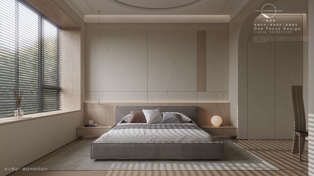 卧室的设计偏向素雅,木色搭配灰色的床品,百叶窗和木质家具,是它的主要特色。床头柜边上摆放简单饰品,整体素净自然,淡雅而不单调。