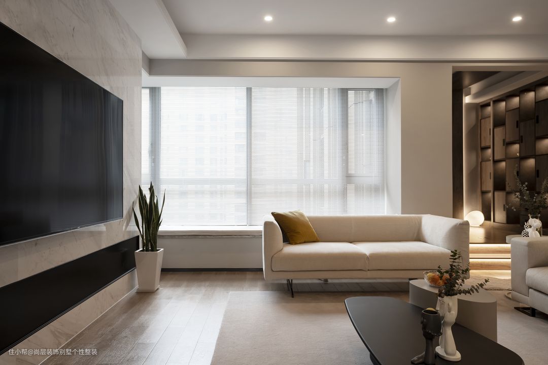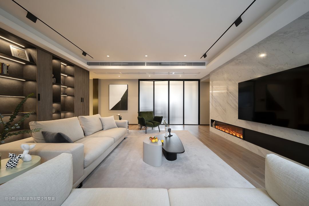 从整体空间色彩到局部陈设布局,设计师进行了严谨的推敲和细致的琢磨,与大理石电视墙背景相对的,是一片深色大面积陈列架,大量的储物空间,方便居者摆放喜爱之物,将心爱的艺术品或书籍摆放,在内置灯光的映衬下,既时尚又高级感十足。